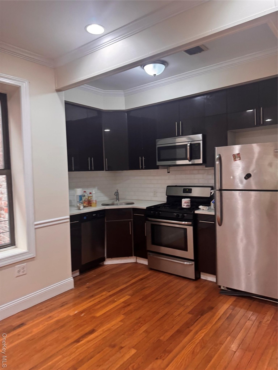 - Kitchen with stainless steel appliances, crown molding, dark cabinetry, dark wood-style flooring, and backsplash