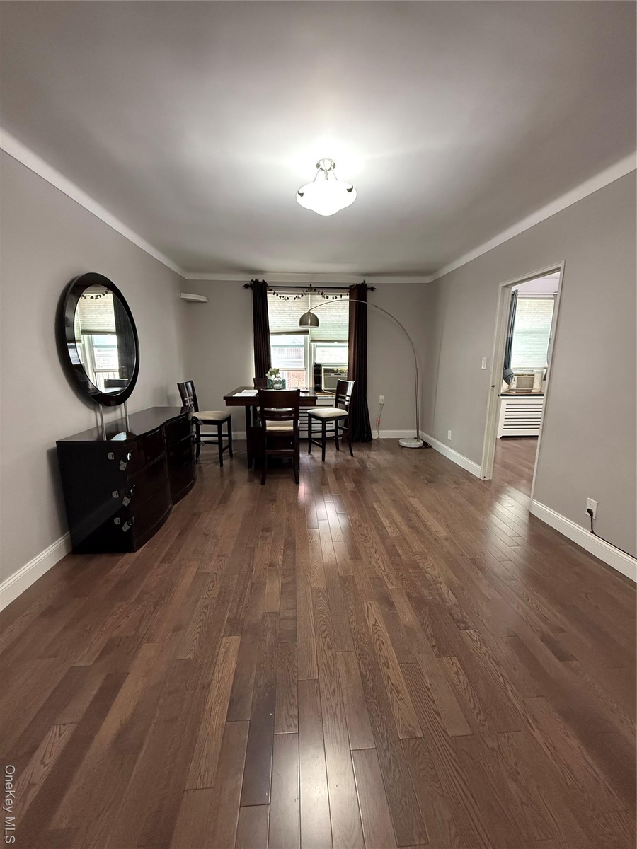 - Dining area featuring dark wood finished floors, ornamental molding, and radiator