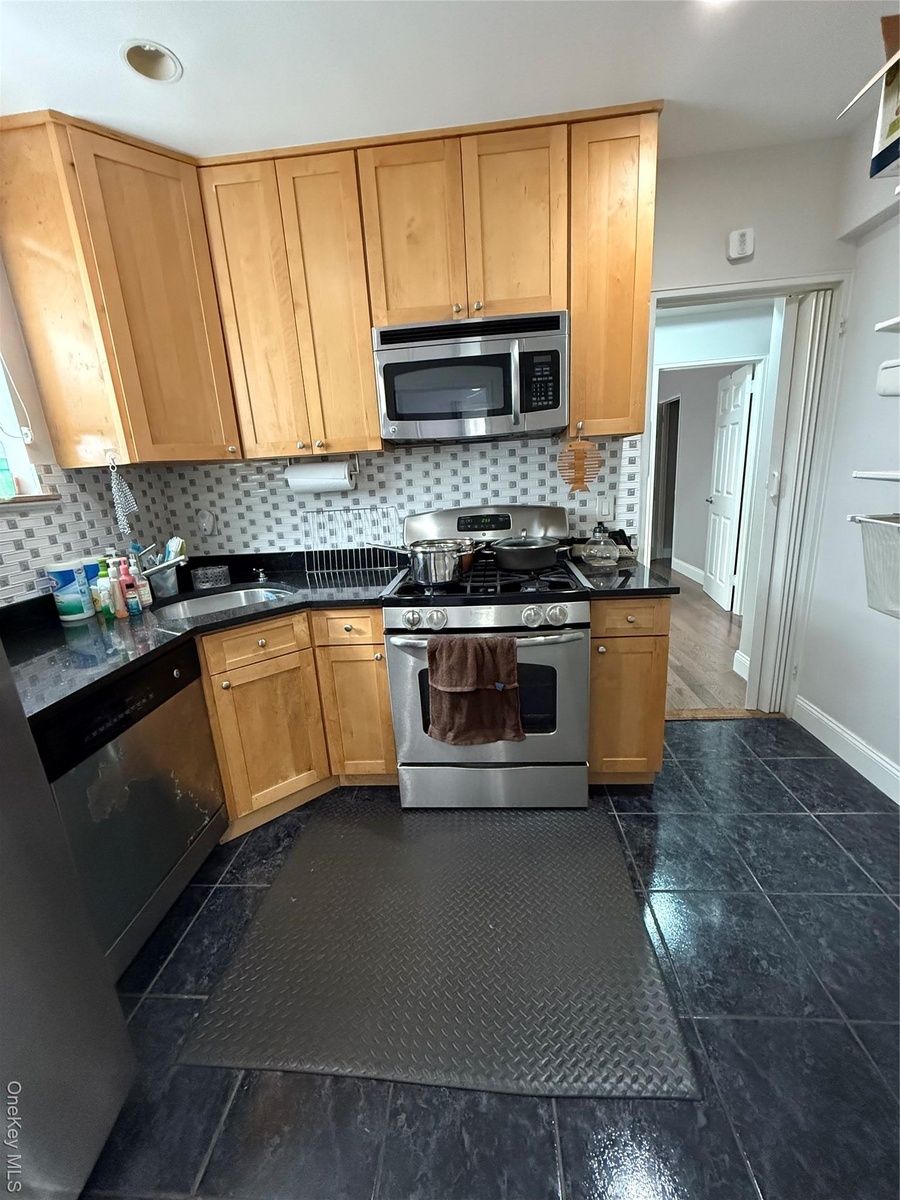 - Kitchen featuring decorative backsplash, stainless steel range, dishwashing machine, dark stone countertops, and recessed lighting