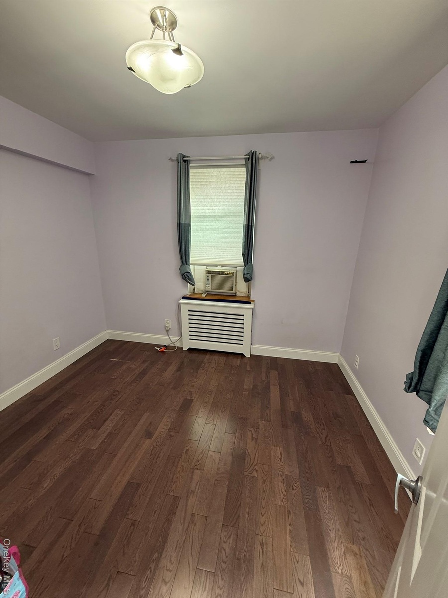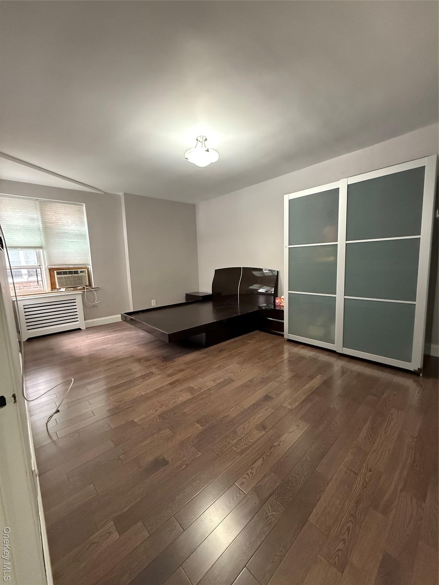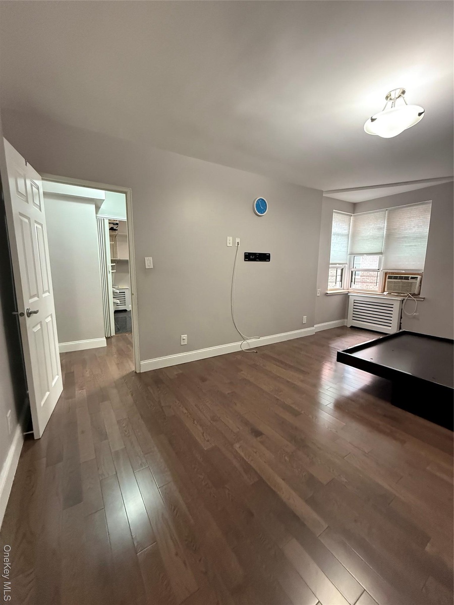 - Unfurnished living room featuring dark wood-style flooring and an AC wall unit
