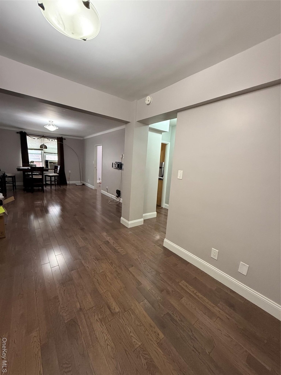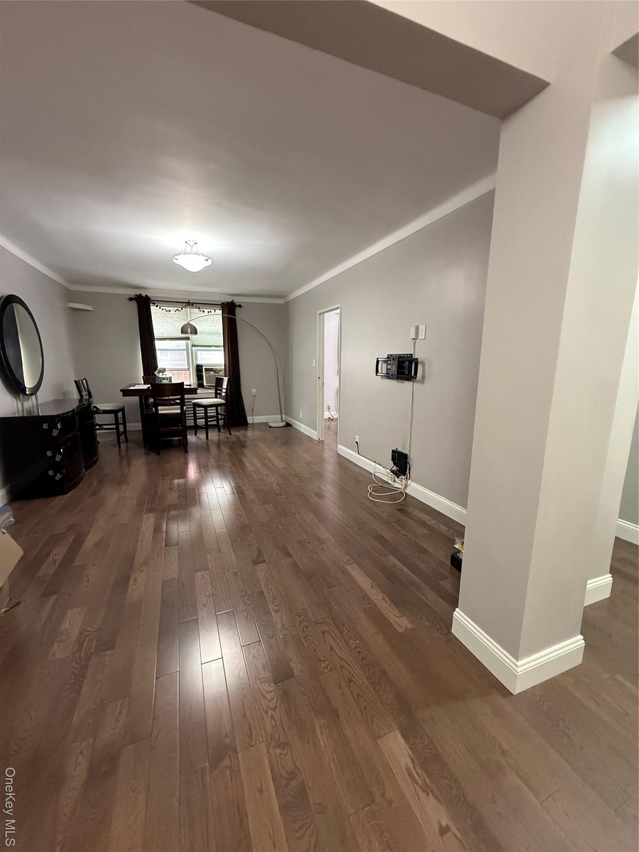 - Unfurnished living room featuring dark wood-style flooring and ornamental molding