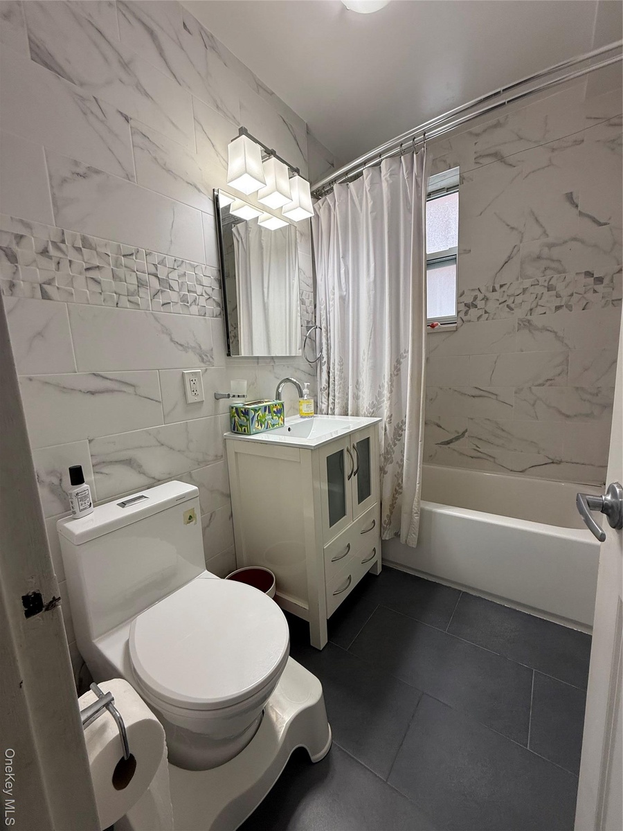 - Bathroom featuring tile walls, shower / bath combo, vanity, and dark tile patterned flooring