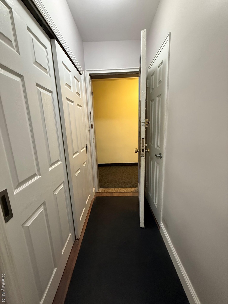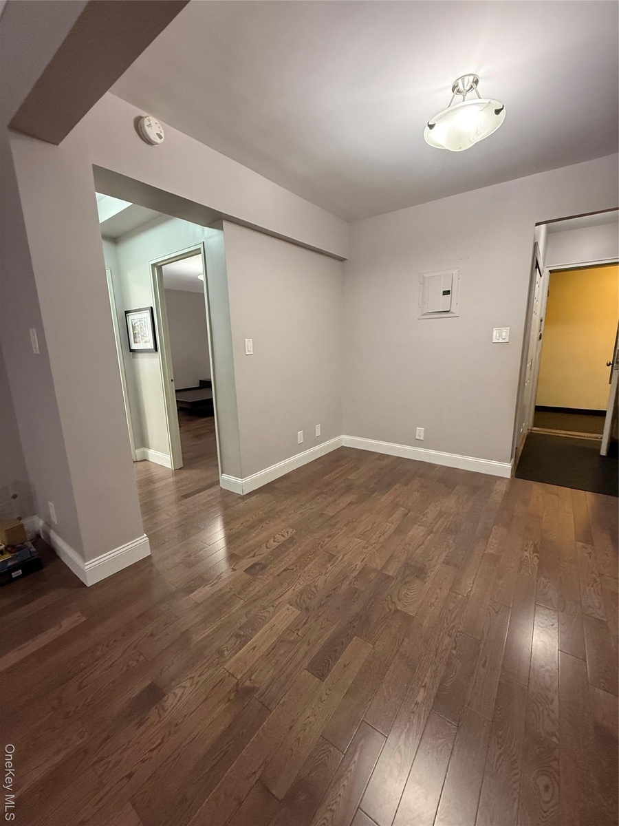 - Unfurnished room with dark wood-style floors and a smoke detector
