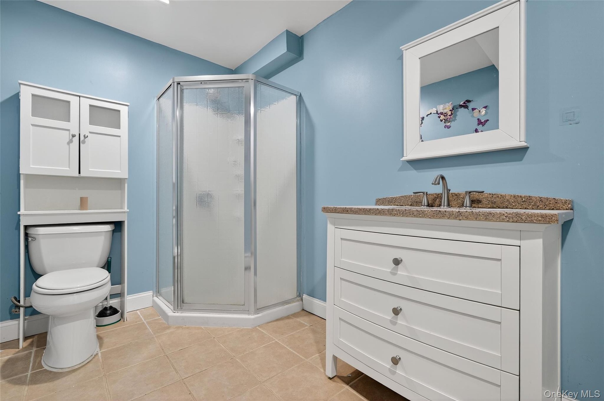 - Full bath with vanity, a stall shower, and light tile patterned floors