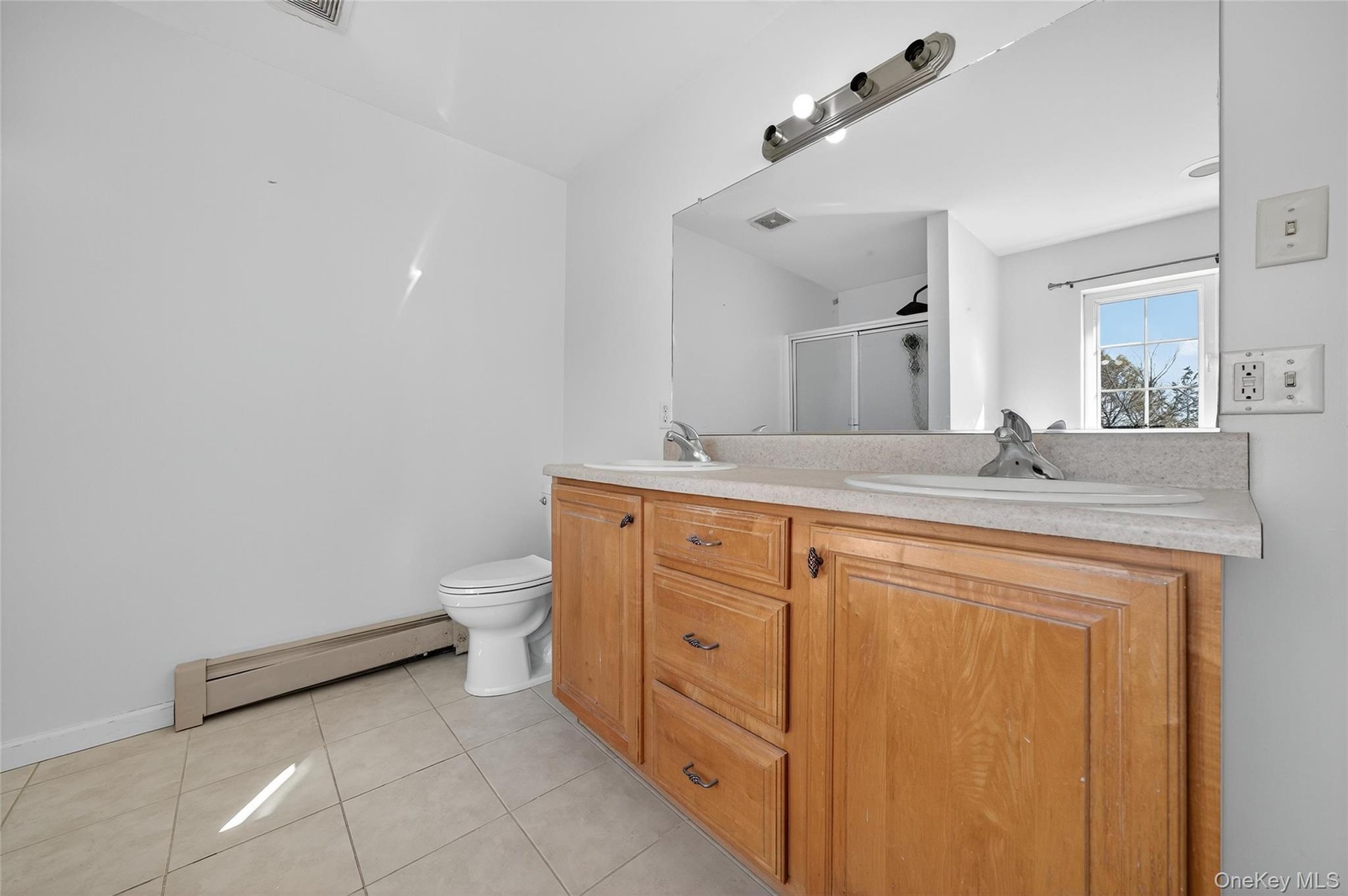- Bathroom featuring a baseboard radiator, light tile patterned flooring, double vanity, and a stall shower