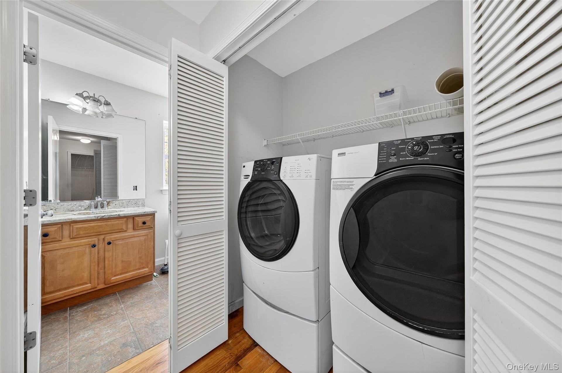 - Laundry room featuring dark wood-style floors and washer and clothes dryer