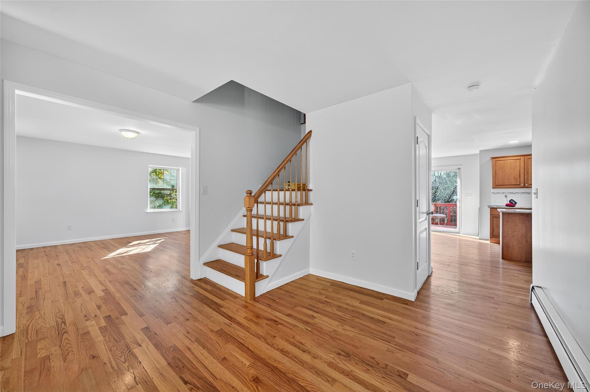 - Foyer entrance with light wood-style flooring, stairway, and baseboard heating