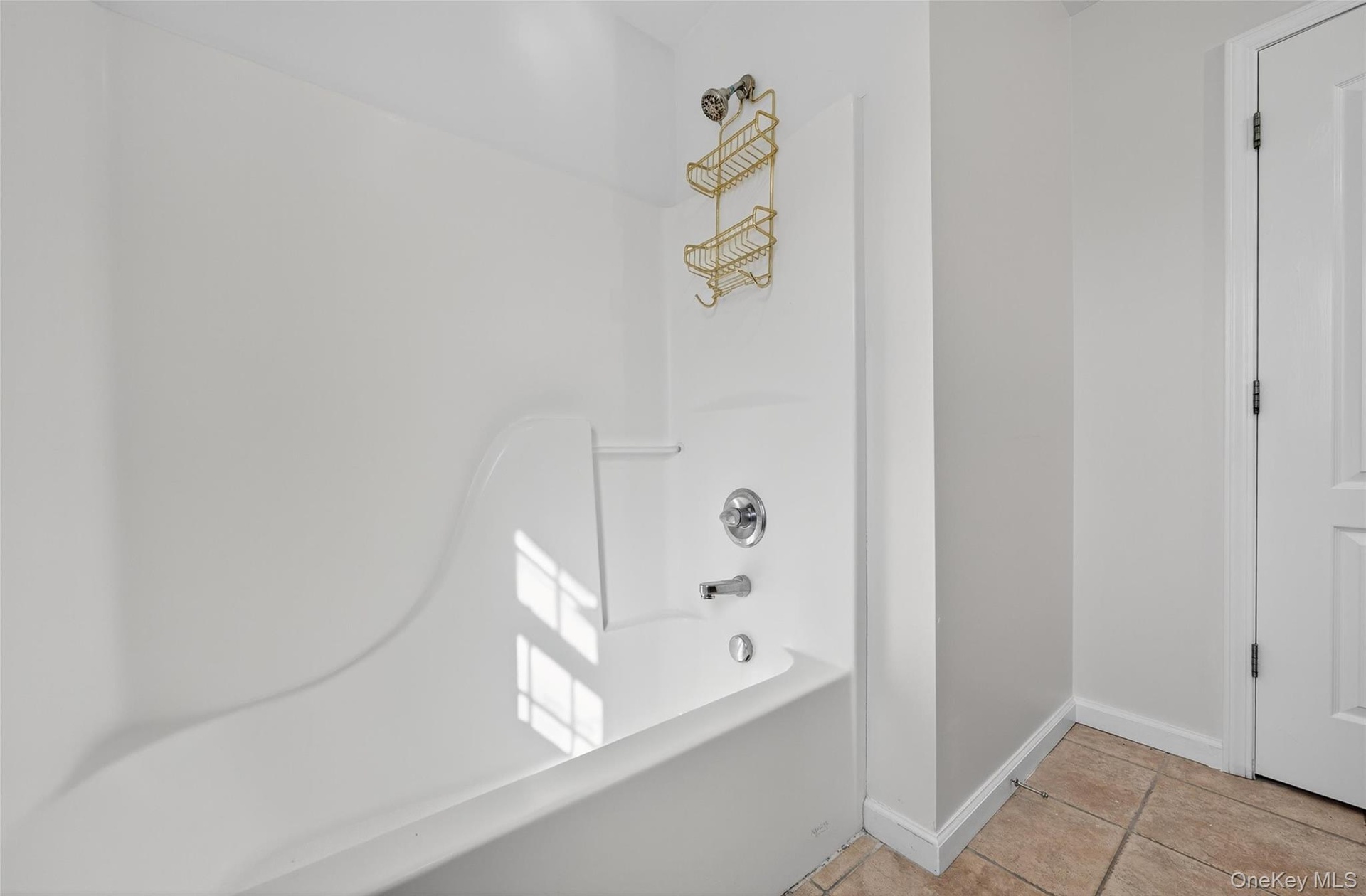 - Bathroom with washtub / shower combination and light tile patterned floors