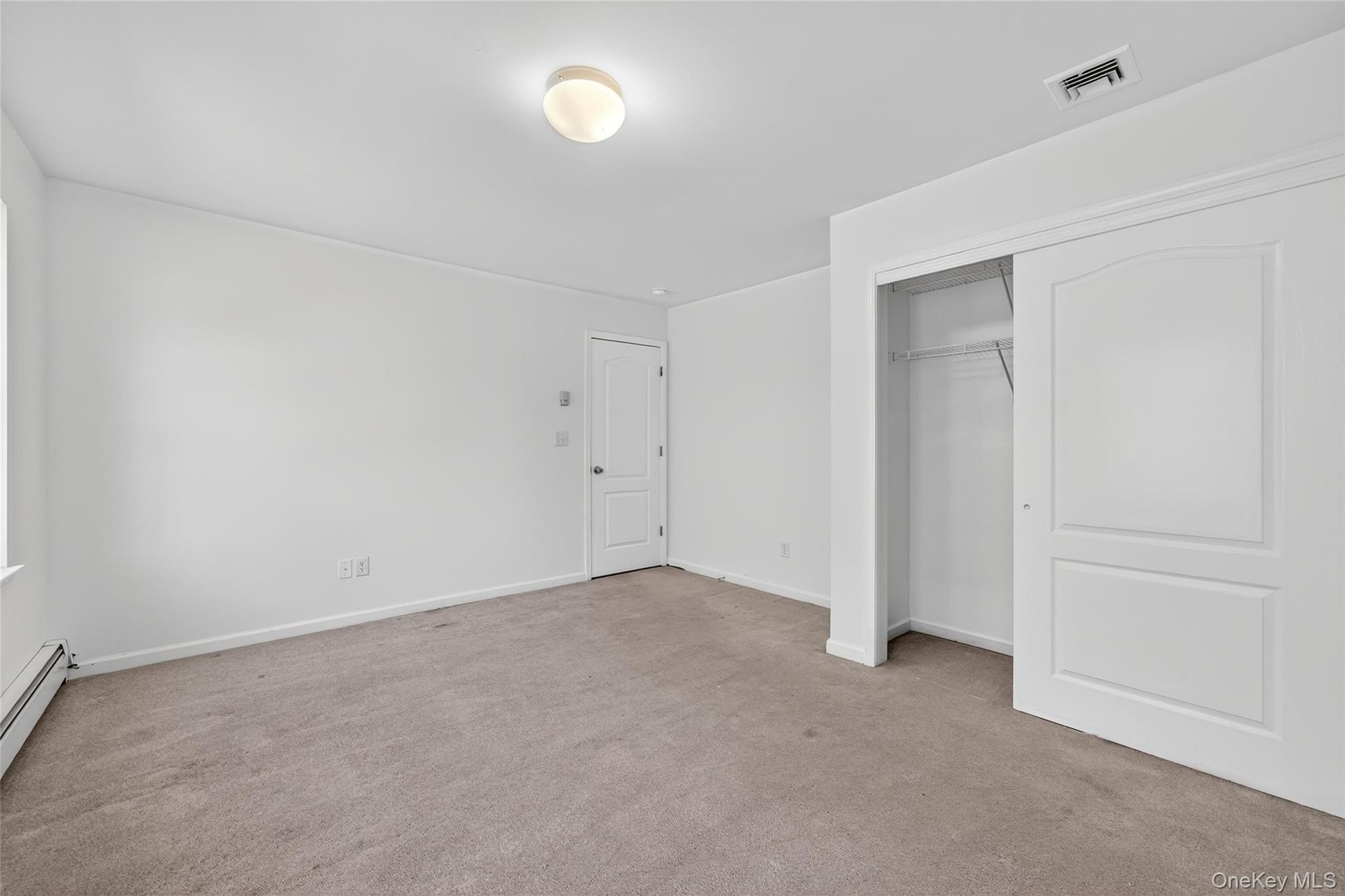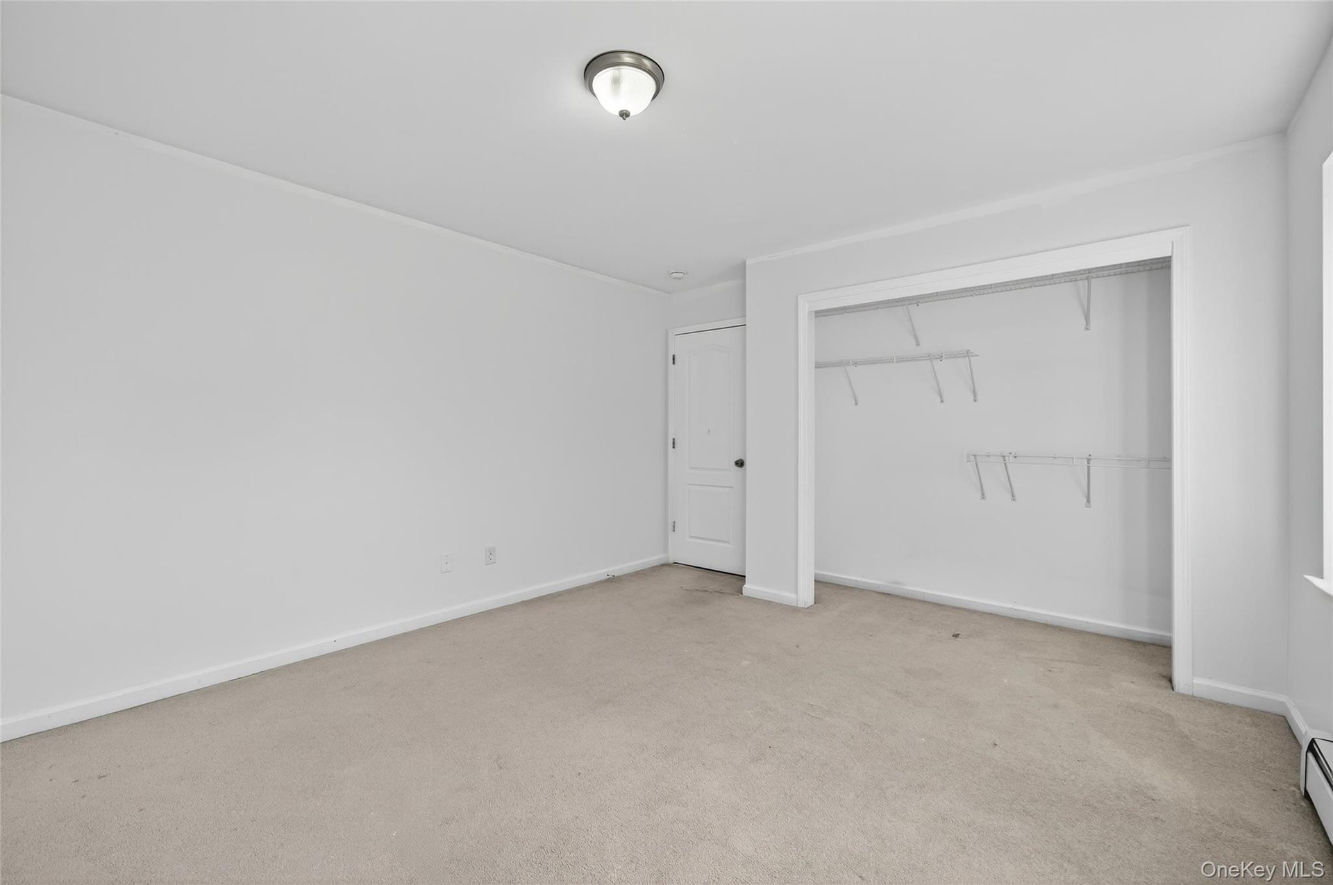 - Unfurnished bedroom with light carpet, a closet, and baseboard heating