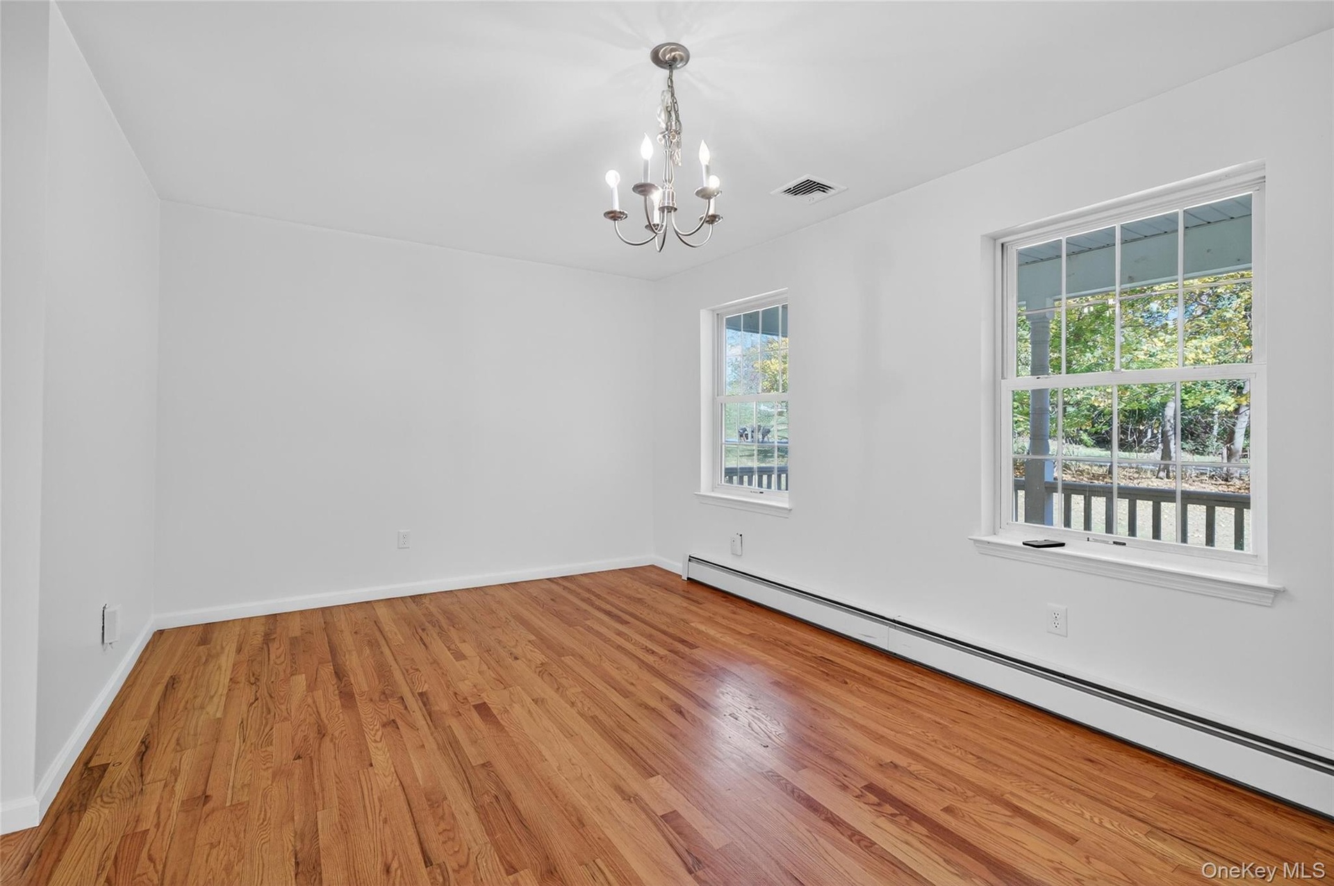 - Unfurnished room with a baseboard heating unit, light wood-type flooring, and a chandelier