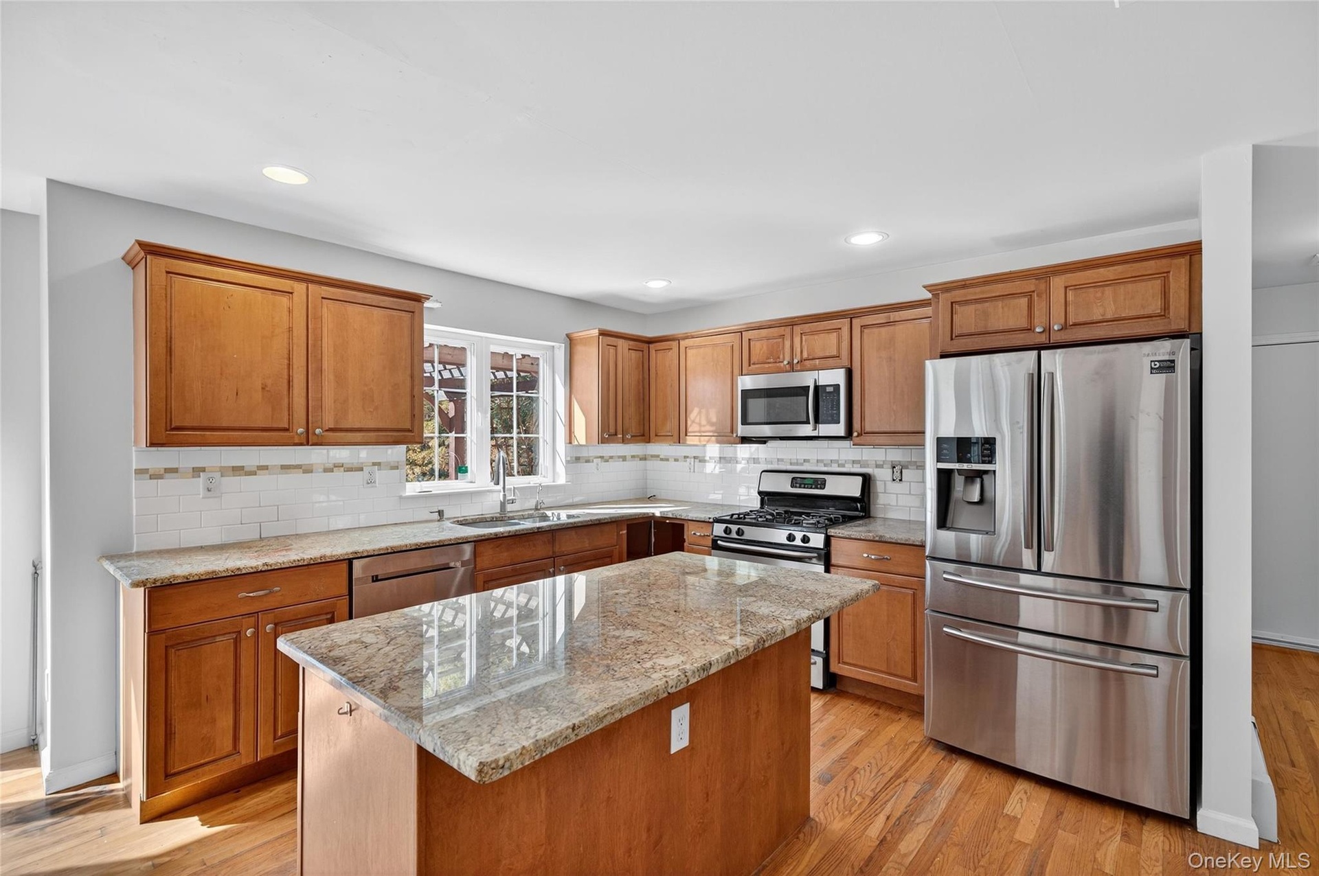 - Kitchen with stainless steel appliances, brown cabinets, light stone counters, and recessed lighting