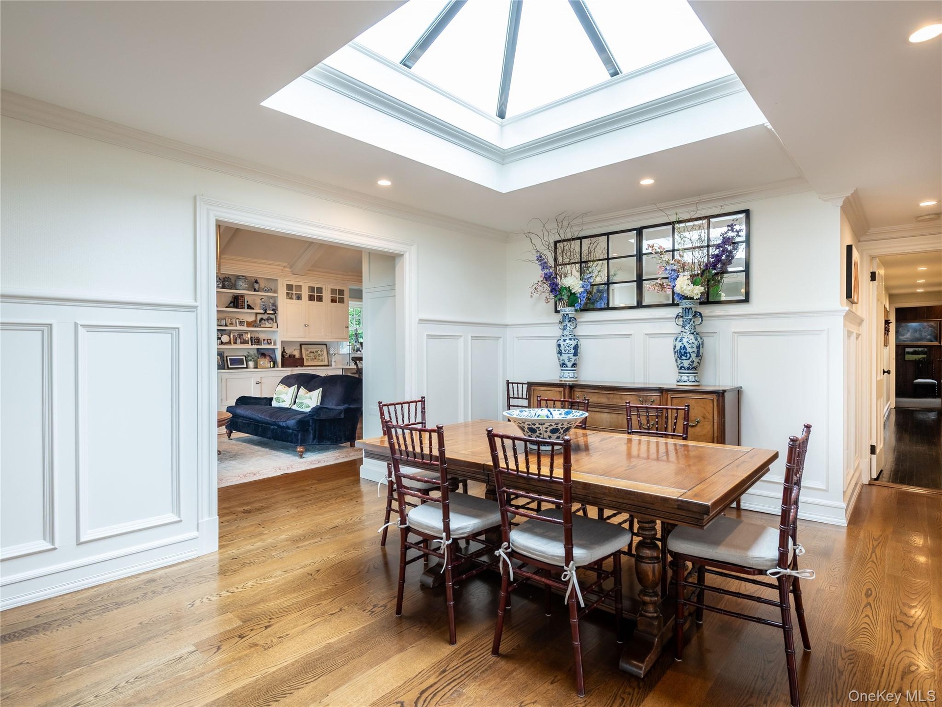 - Dining space with a decorative wall, ornamental molding, a skylight, recessed lighting, and wood finished floors