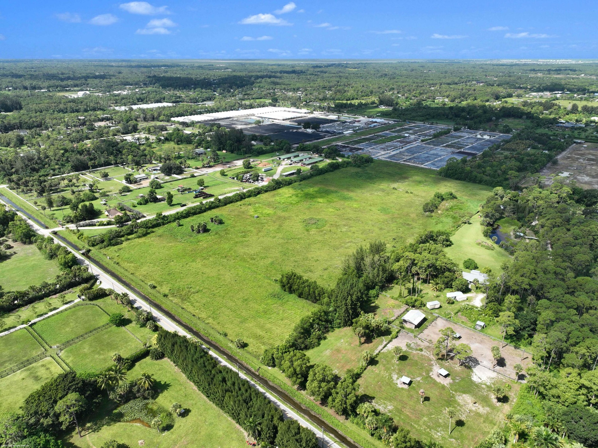 DescriptionExceptionally private 20-ACRE property on paved E road with easy access to Okeechobee Rd. This rare and unique offering is currently composed of two contiguous 10-acre parcels but may be combined into one or further subdivided into four 5 acre parcels. The land is cleared, fully fenced, and ready for a wide range of uses. Equestrian enthusiasts will appreciate the space for a regulation polo field, multiple arenas, barns and numerous equestrian features. Others may envision a nursery, farm, or custom estate with space and privacy. The property is mostly high and dry with elevations about 20ft ASL. Existing storm water management includes a small pond and some drainage infrastructure that empties into the main canal just to the east. Additionally, electric is already on-site.