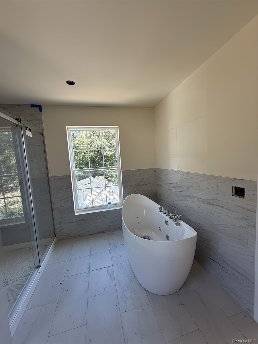 - Bathroom with tile walls, wainscoting, a shower stall, a freestanding tub, and marble finish flooring