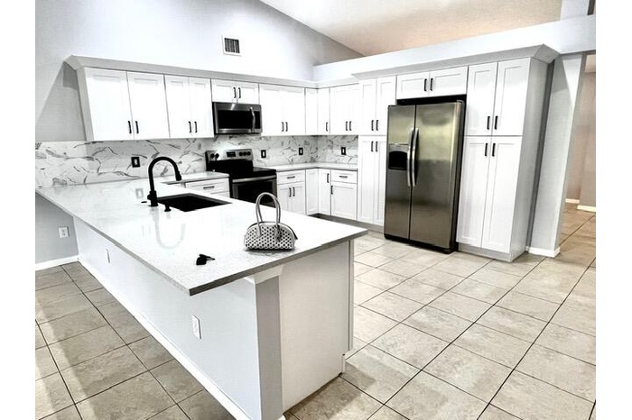 DescriptionCITY WATER and REMODELLED 3-bedroom 2- bathrooms home with a separate den /office, screened in porch, separate air-conditioned laundry room and a two-car garage. The lot is one of the highest in the subdivision. This thoughtfully designed split floor plan home provides both privacy and functionality, making it perfect for families, entertaining, or simply enjoying extra space. Very high vaulted ceiling in the dining room, kitchen and living room with an open floor plan. New Roof and driveway installed in May 2025, newer A/C. Freshly painted interior and exterior. Brand new kitchen with white shaker cabinets, quartz countertop and beautifully tiles backsplash and Stainless-steel appliances. Remodeled bathrooms with new vanity, quartz countertop and double sink. Room sizes are approximate.