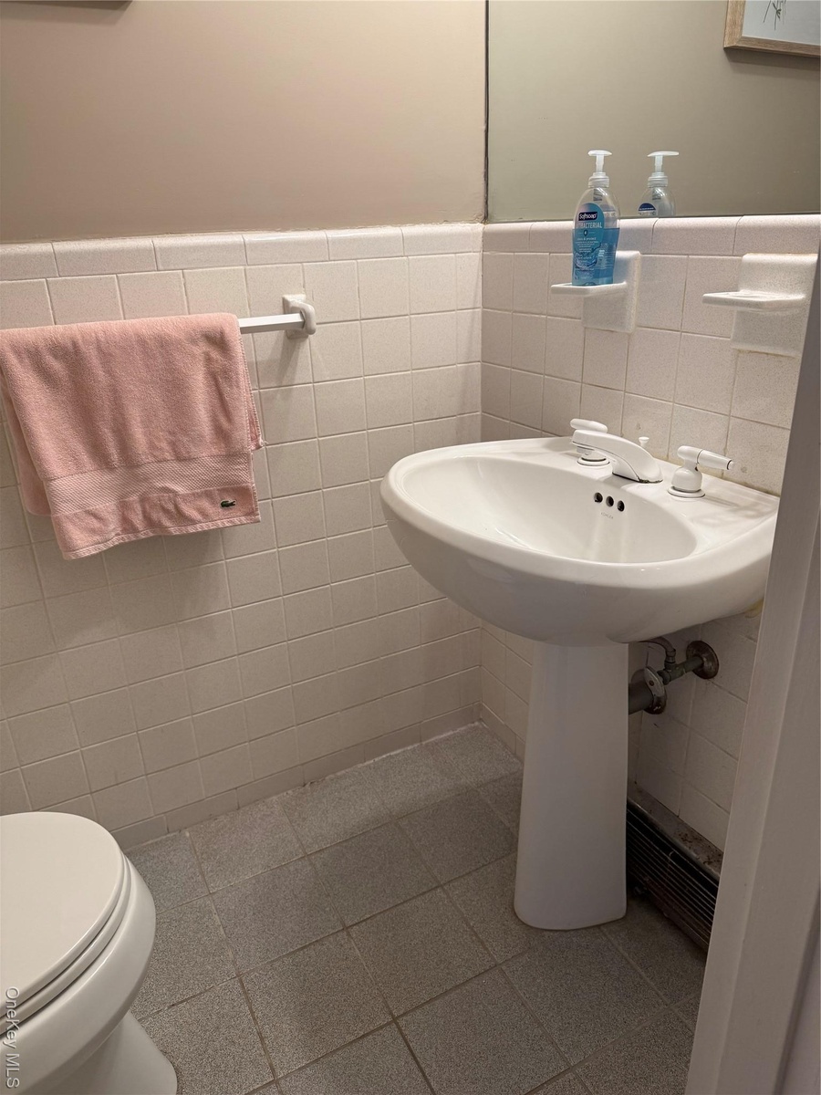 - Bathroom featuring tile walls and wainscoting