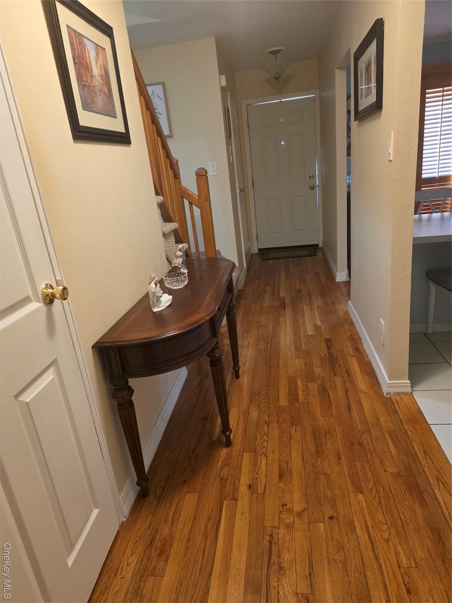 - Doorway to outside with wood finished floors and stairway