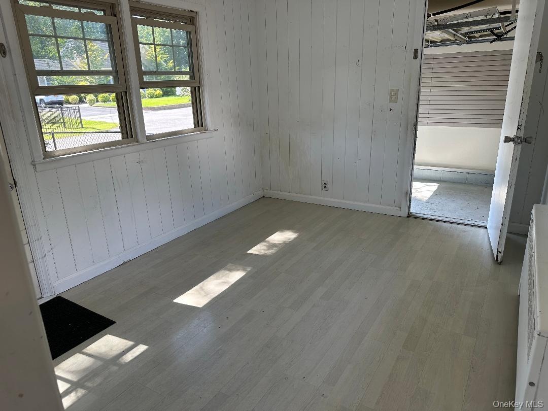 - Foyer entrance featuring radiator, wood walls, and light wood-style flooring