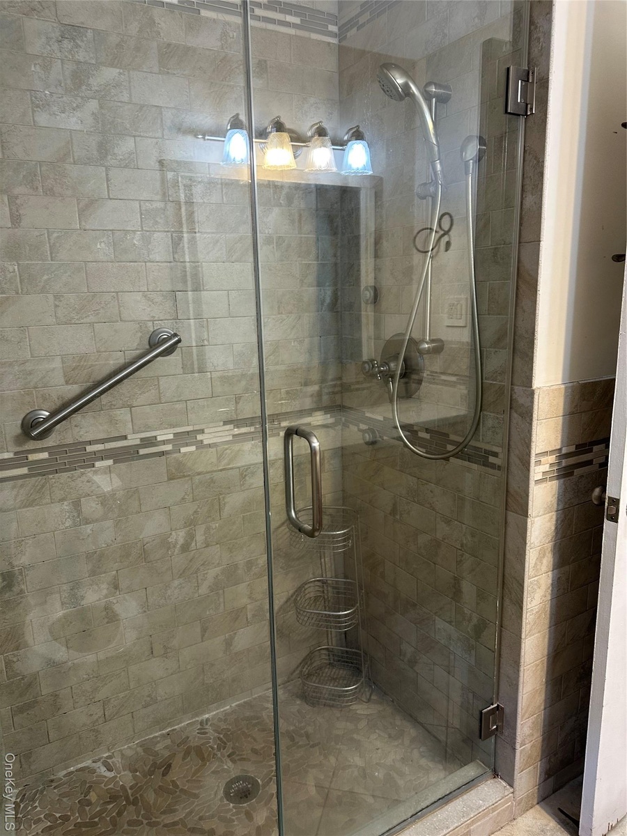 - Full bath featuring vanity, radiator, light tile patterned floors, tile walls, and a stall shower