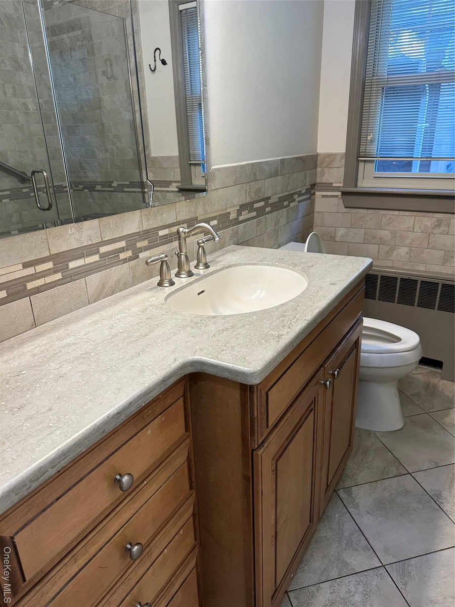 - Bathroom featuring radiator heating unit, vanity, a stall shower, tile walls, and light tile patterned floors