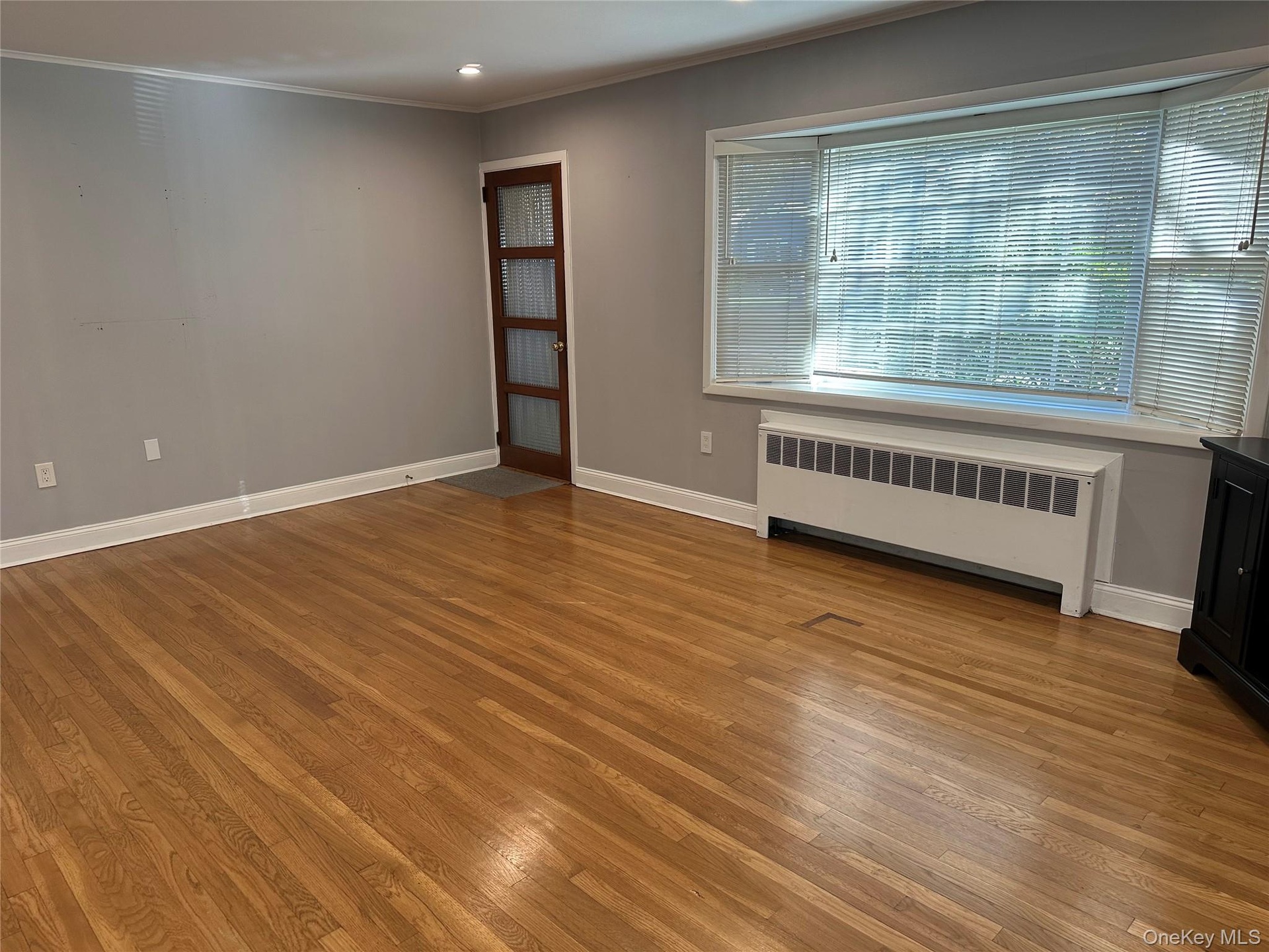 - Unfurnished room with radiator, ornamental molding, and light wood-style flooring
