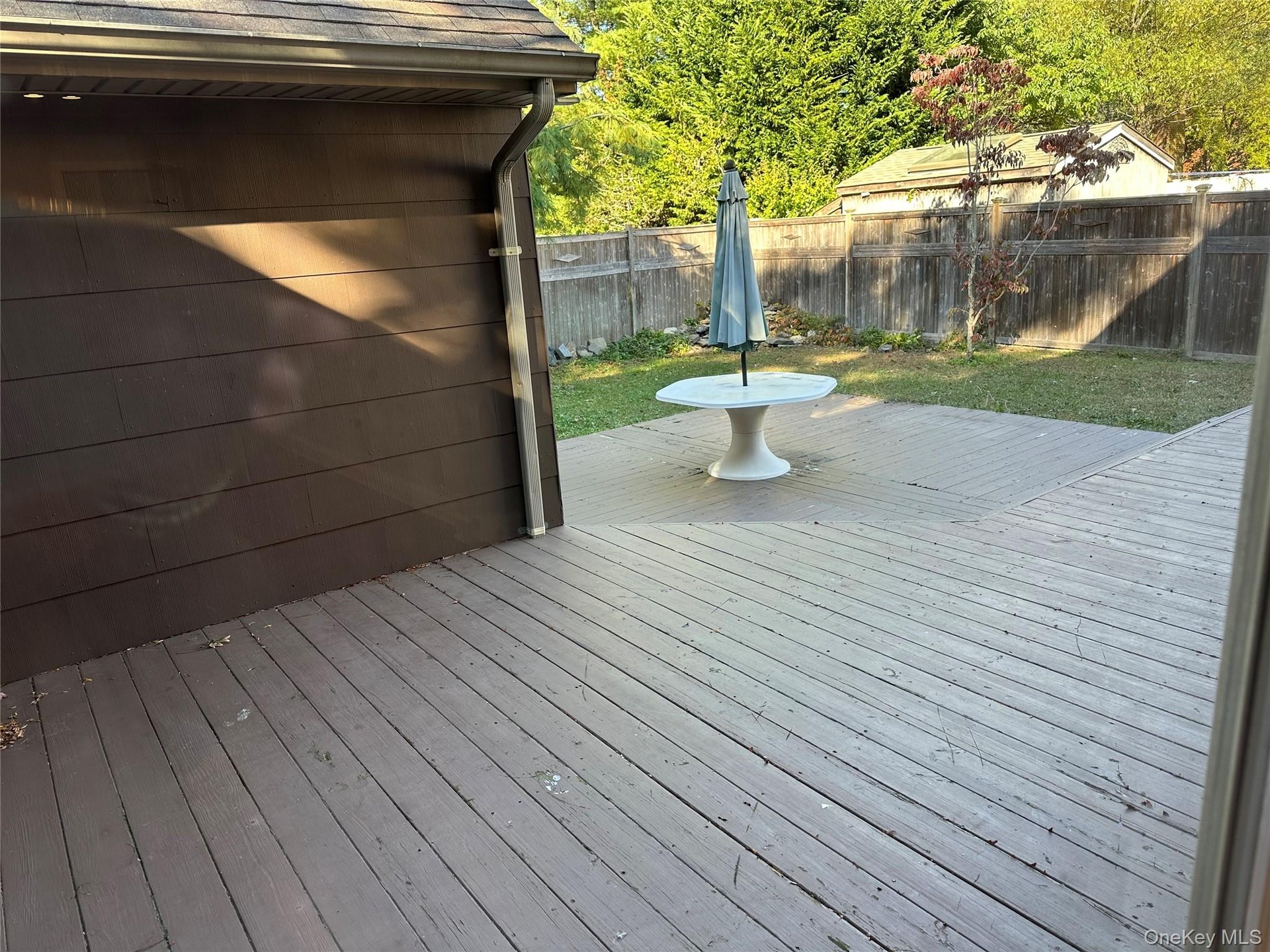 - Wooden terrace featuring a fenced backyard and view of wooded area
