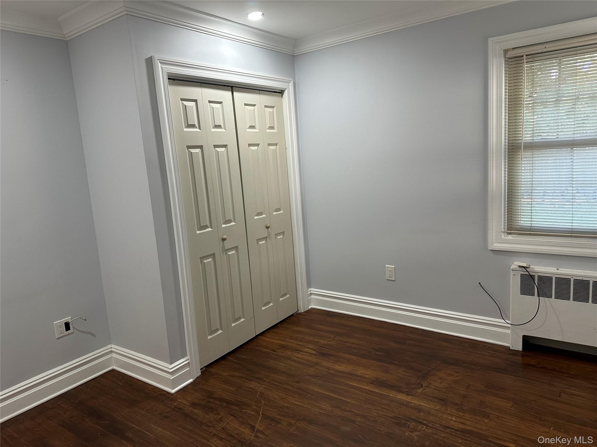 - Unfurnished bedroom with radiator, ornamental molding, dark wood-style flooring, recessed lighting, and multiple windows