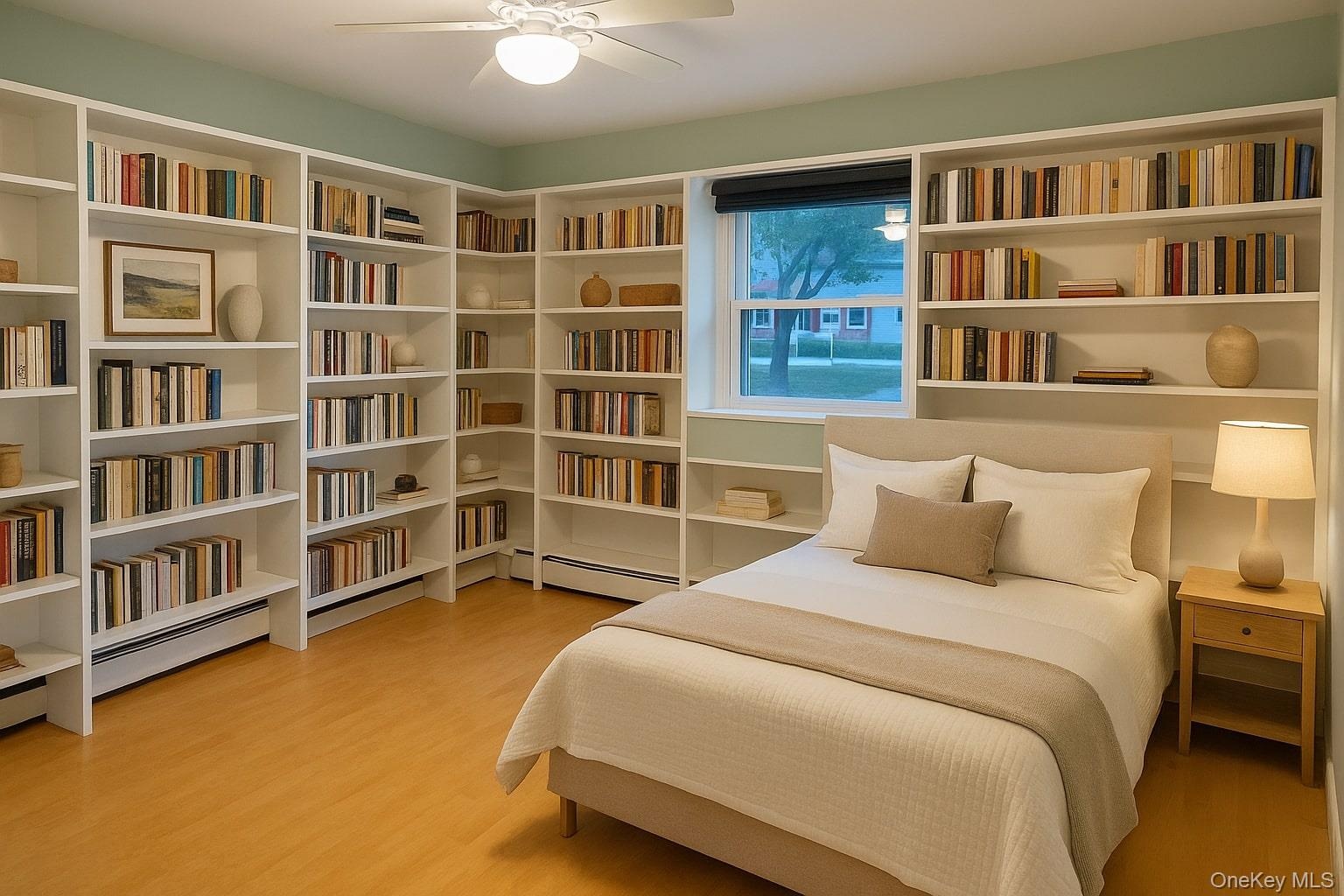 - Staged using AI. 1st fl bedroom with light wood-style floors, a ceiling fan, and a baseboard heating unit