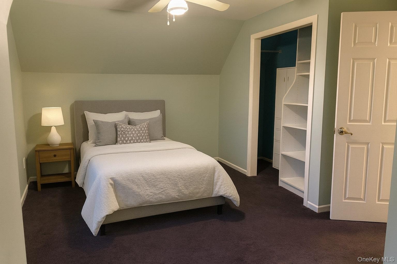 - Staged using AI. 2nd fl bedroom with lofted ceiling, dark colored carpet, and ceiling fan