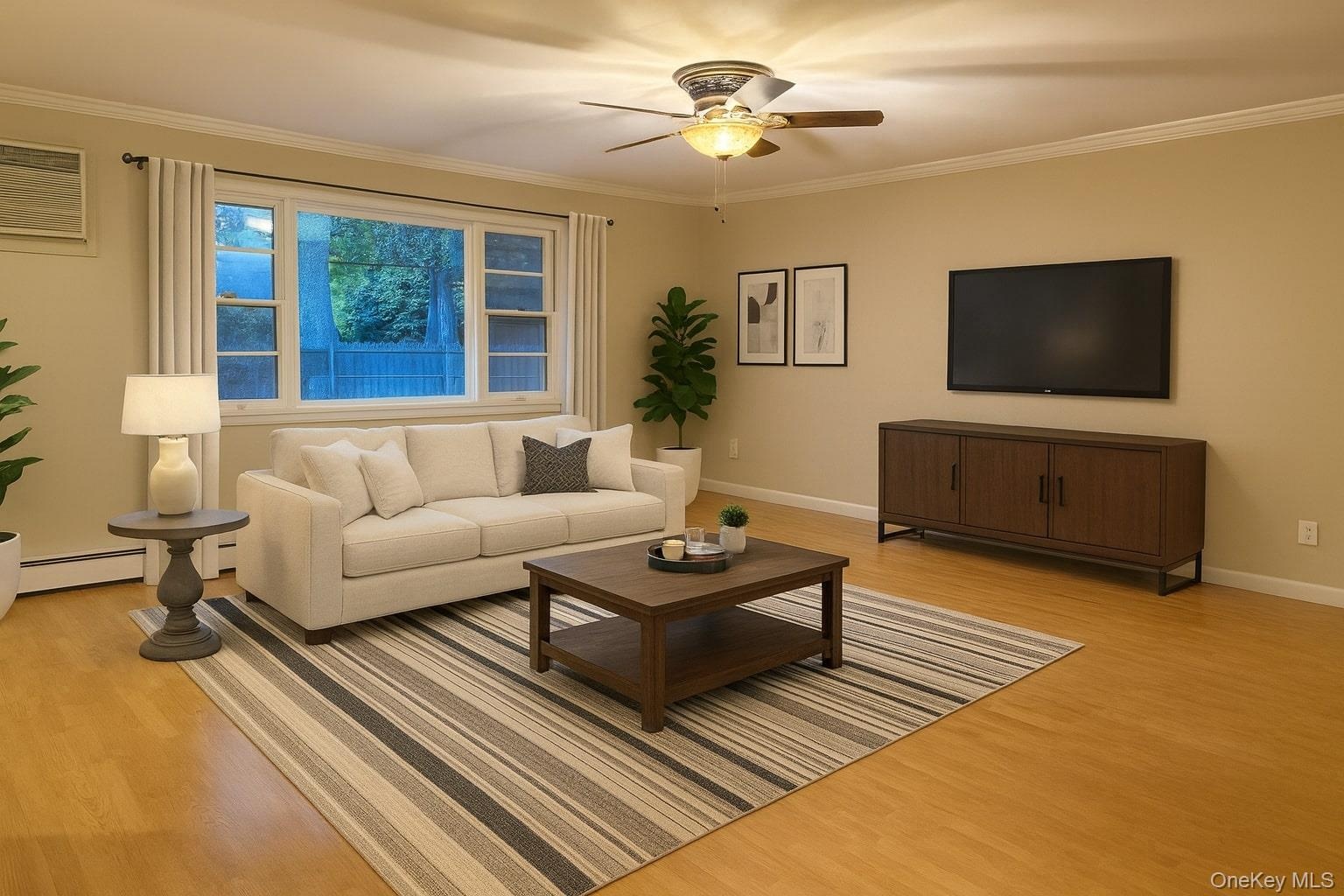 - Staged using AI. Living room featuring crown molding, light wood-style floors, a wall mounted air conditioner, a baseboard radiator, and a ceiling fan