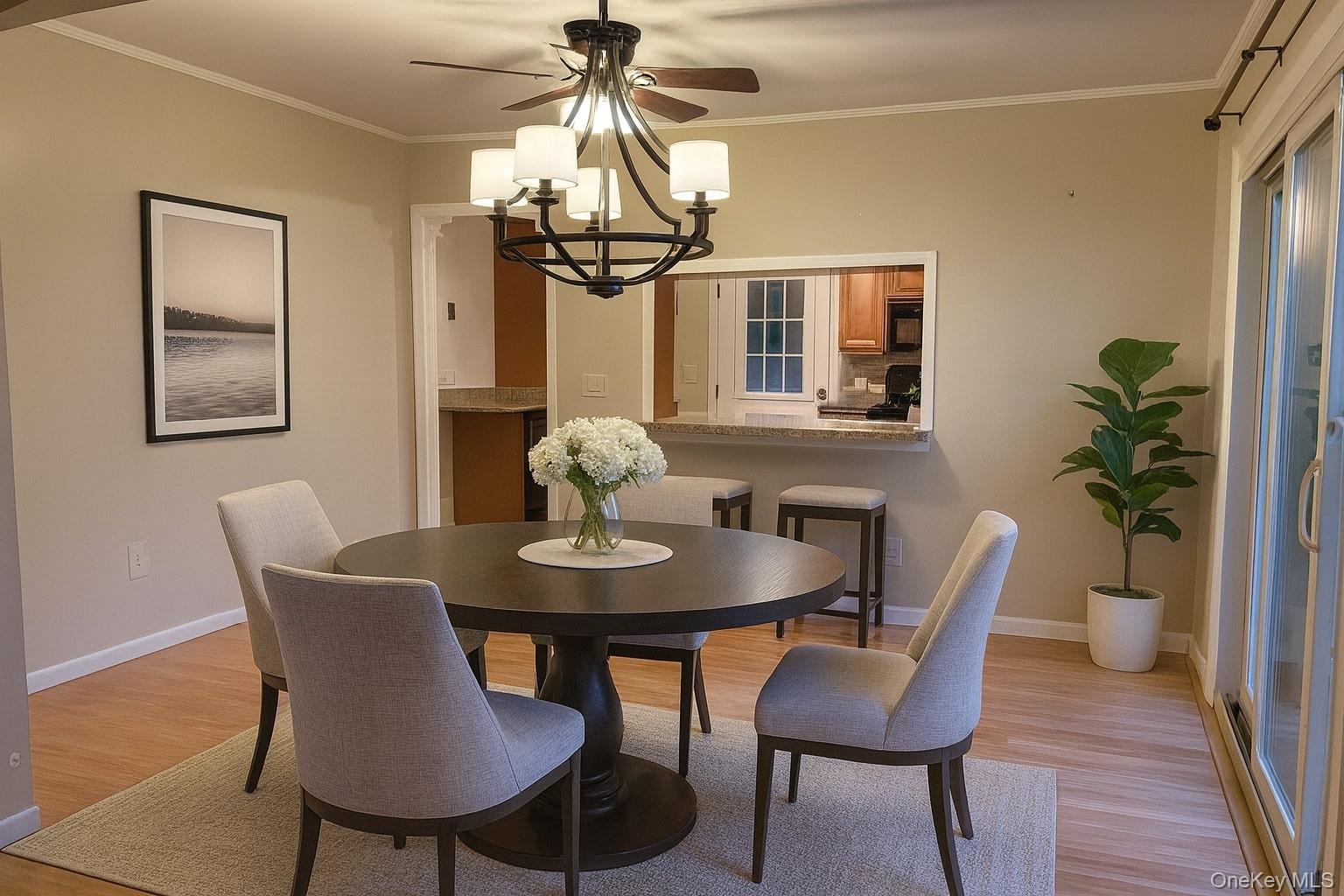 - Staged using AI. Dining space featuring crown molding, light wood-style floors, and a chandelier