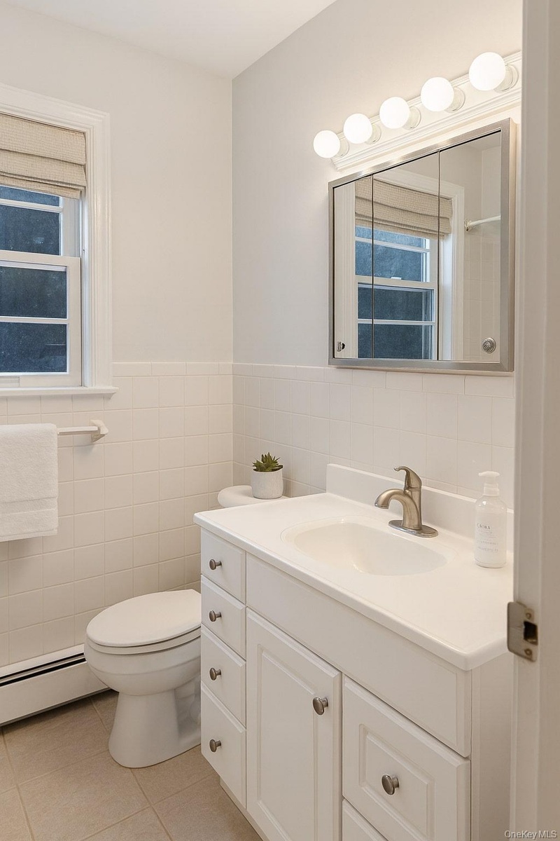 - Staged using AI. Bathroom with tile walls, baseboard heating, vanity, light tile patterned flooring, and wainscoting