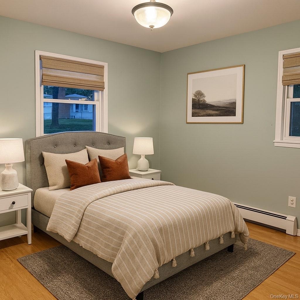 - Staged using AI. 1st fl bedroom with light wood-style floors and a baseboard radiator