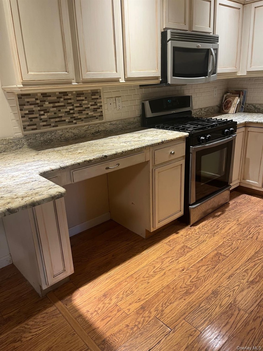 - Kitchen with a built in desk, stainless steel appliances, quartz counter tops, custom cabinets, tasteful backsplash, hard wood floors