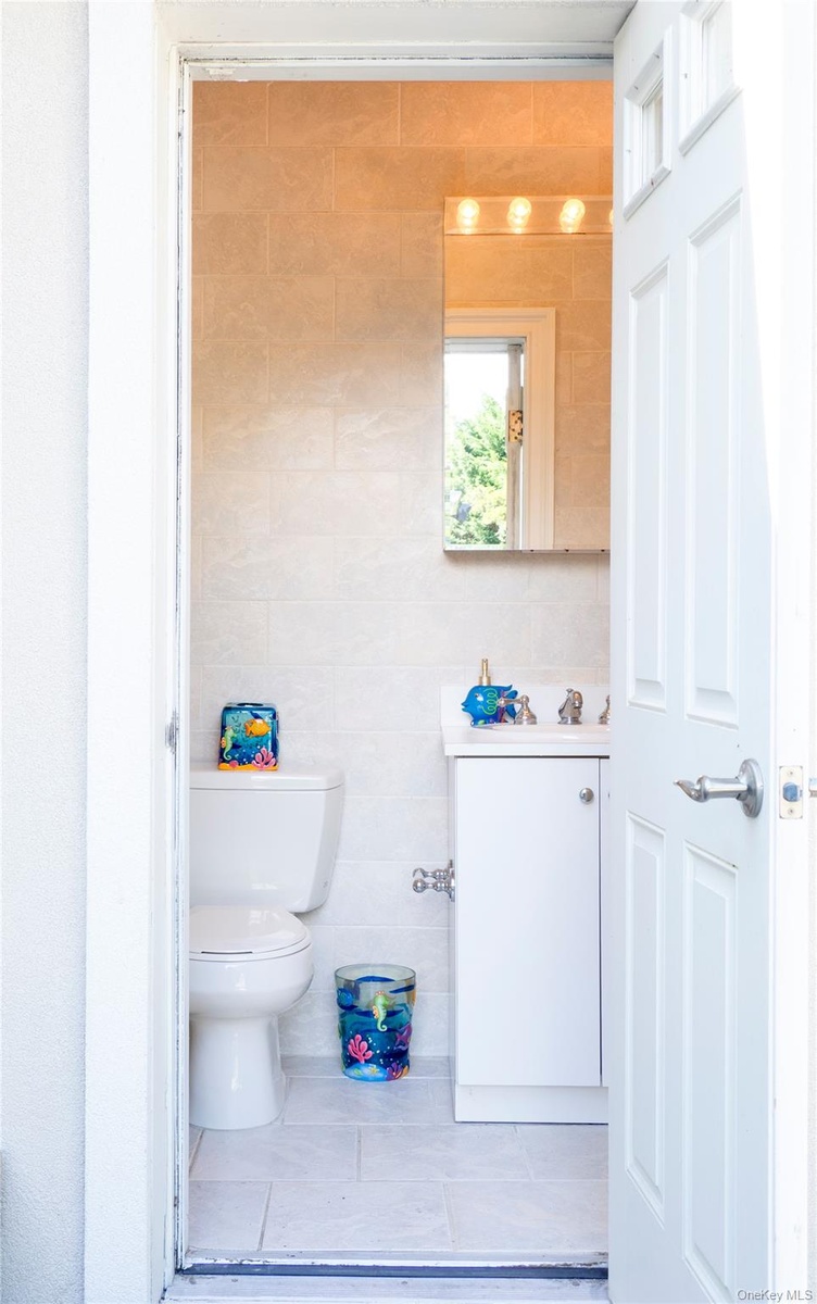 - Full bathroom featuring tile walls, crown molding, a bath, vanity, and healthy amount of natural light