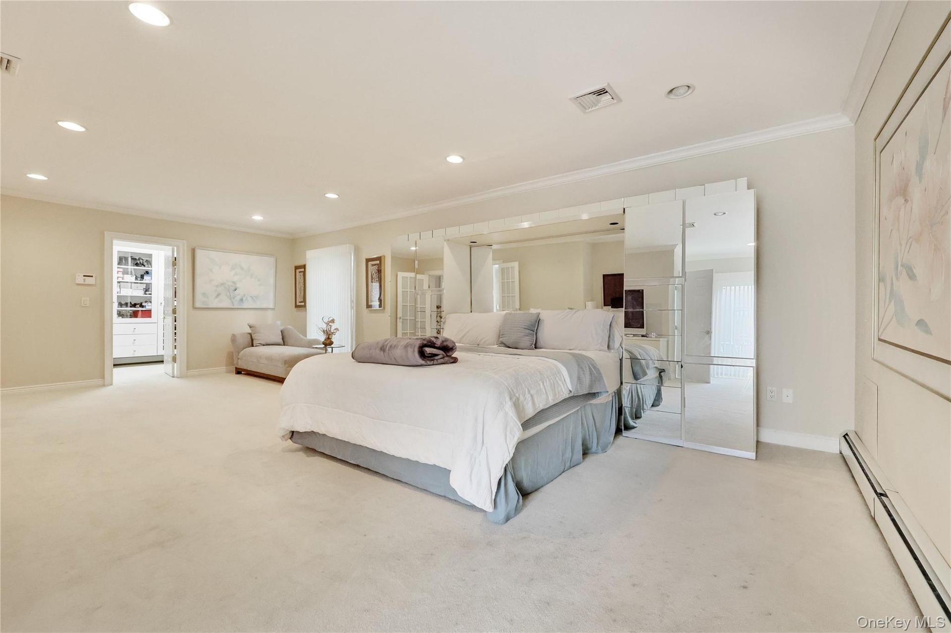 - Bedroom featuring crown molding, light colored carpet, recessed lighting, and a baseboard heating unit