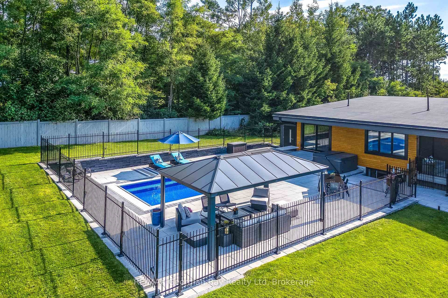 Every Once in awhile a Special Home comes along! This Modern Architectural Custom Built Bungalow Blends All The Current Luxuries You can Dream of In A Warm And Inviting Setting. This is a True Entertainer's Paradise Nestled On a Private 1.5 Acre Lot. The Great Room has Soaring Vaulted Ceilings And A Wall Of Windows Overlooking The Countryside. Open Concept Kitchen/Living/Dining Boasting Custom Framed Cabinetry With a 10' Island & Extra Sink. Top of the Line Appliances. Main Floor Primary Suite With A Huge Walk In Closet & Beautiful Ensuite. This Resort Style Oasis Boasts a 16 x 30 ft Heated Salt Water Pool, Outdoor Pergola, Hot Tub with Multiple Seating Areas To Enjoy The All Day Sun! Plenty Of Room For Extended Family Or Large Gatherings With Almost 5000 Square Feet with a Professionally Finished Basement. 3 Bedrooms On Main Level (Or Main Floor Office) Plus 2 Bedrooms & Huge Family Room in Basement with 2 more Bedrooms. Inside Entry from Garage to Main & Lower Floors. 38 x 37 Ft Garage/Shop That Accommodates 3+ Cars, Driveway Parking For Approx. 15+ Vehicles or Turn it into your own Pickleball Court. Far Too Many Features To List - Be Sure To Watch Virtual Tour.