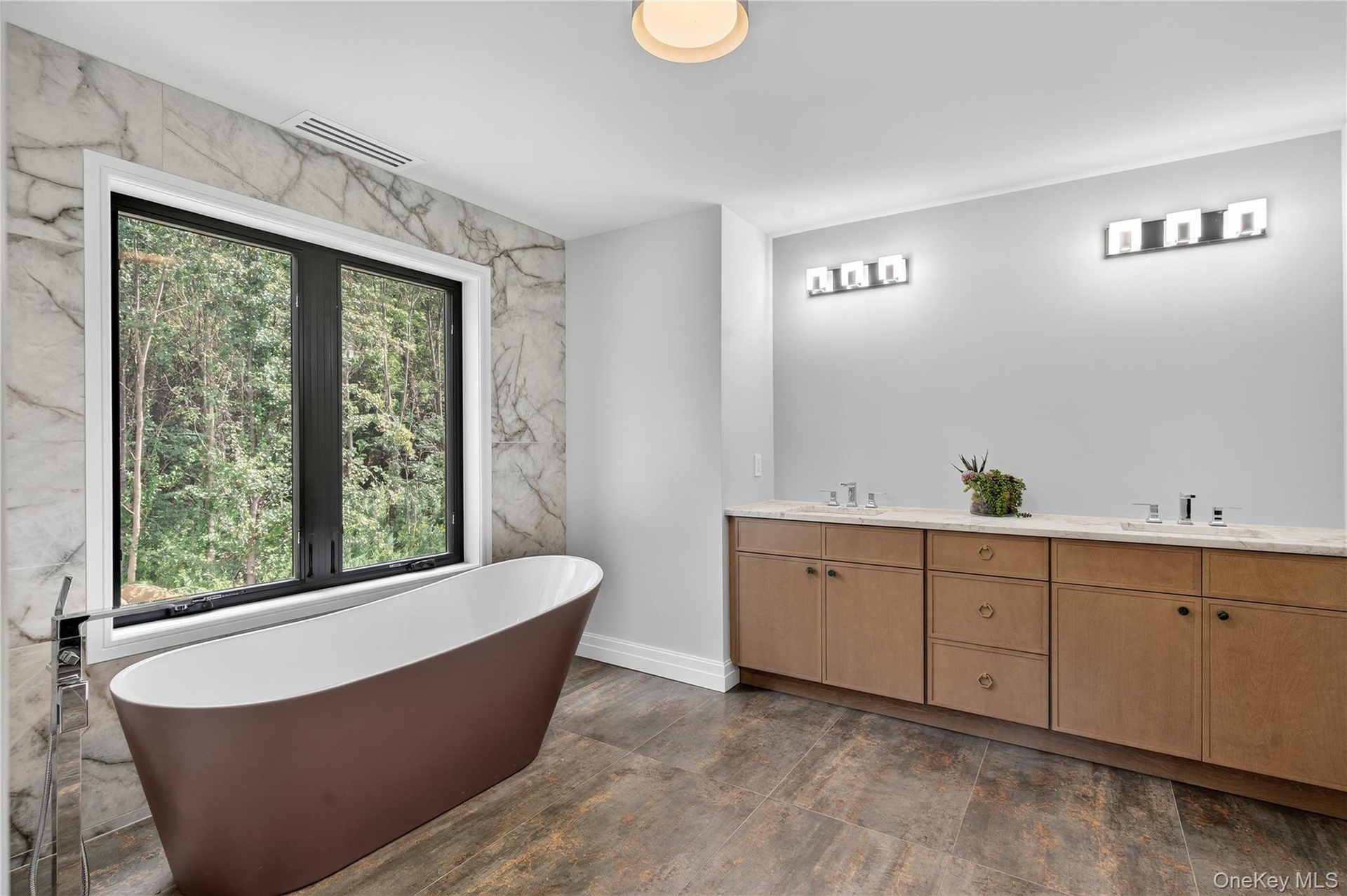 - Bathroom with a marble finish shower, a freestanding tub, and recessed lighting