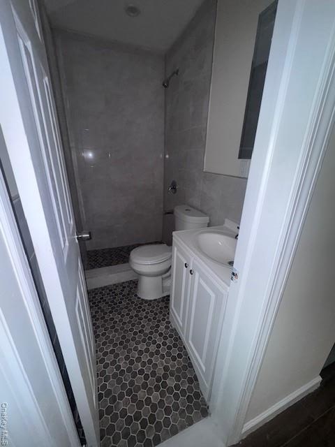 - Full bathroom featuring a shower stall, vanity, tile walls, and dark tile patterned floors