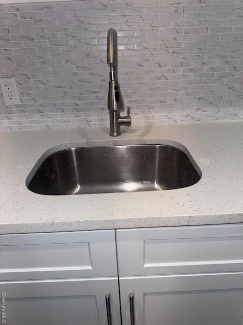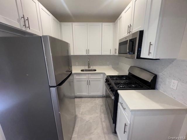 - Kitchen with appliances with stainless steel finishes, light stone counters, white cabinetry, and decorative backsplash
