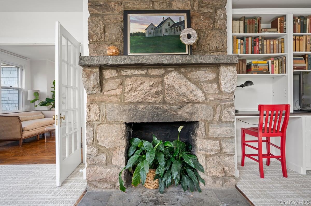 - A charming stone fireplace adds warmth and texture to this inviting study area, featuring built-in shelving and a cozy workspace.