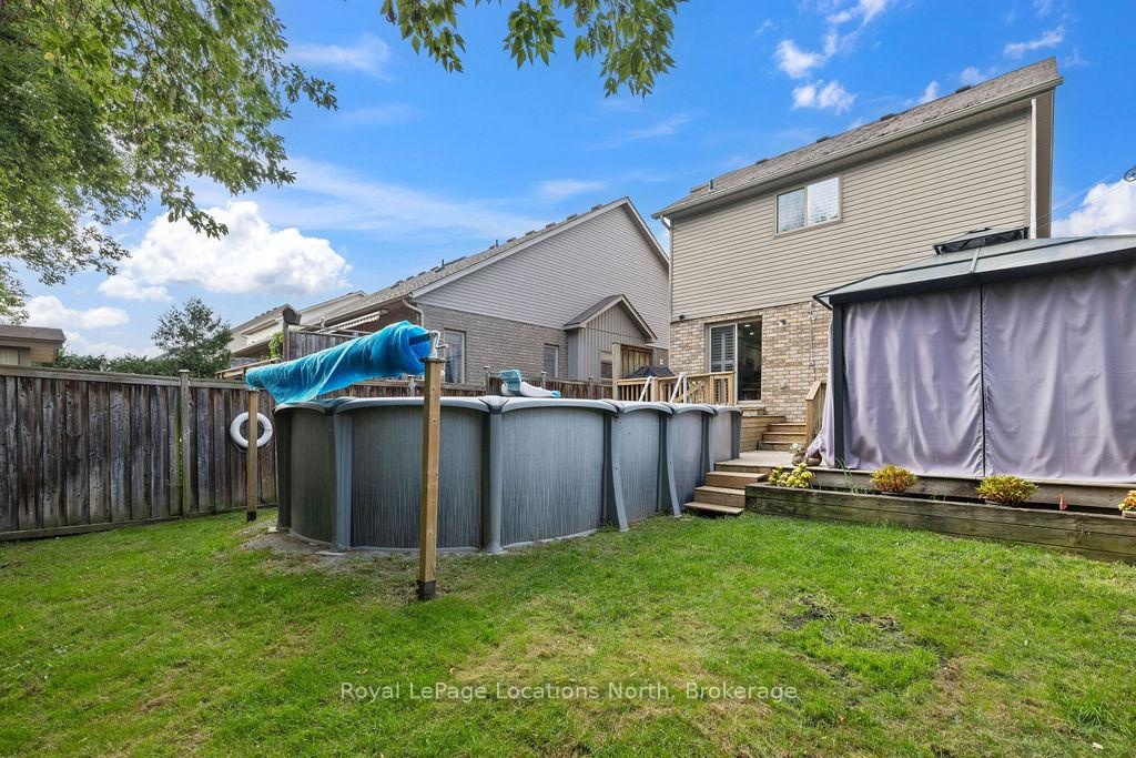 Backyard Beautiful Pool backing onto woods with Georgian Trail nearby - Welcome 115 Chamberlain Crescent, ideally situated in a sought-after neighbourhood backing on to nature's forest complete with cardinals, blue jays and more! A well built Devonleigh home, the property offers a rare opportunity to enjoy privacy, nature, and outdoor living right from your backyard while still being close to schools, shopping, and everyday amenities.The main floor is warm and inviting, designed with pot lights throughout and a gas fireplace that creates a cozy living space. The kitchen has been refreshed with new countertops, a modern glass backsplash, and all stainless steel appliances. The dining area features a walkout to the back deck that makes barbecuing and entertaining easy. At the front of the home, a bright office overlooks the street and beautiful gardens, offering plenty of natural light and the perfect spot for working from home. This level is completed by a convenient 2-piece bathroom and inside entry from the 1.5-car garage for everyday ease. Upstairs, you'll find all three bedrooms together, complemented by California shutters. The primary bedroom offers a walk-in closet and ensuite. The finished lower level adds plenty of additional living space, complete with a second gas fireplace, laundry area, and room for family activities or entertaining guests.The backyard is fully fenced and tailored for outdoor enjoyment, complete with a beautiful three-year-old above-ground heated pool, perfect for making the most of summer days. An irrigation system keeps the lawn lush and green, while the generous yard provides plenty of space for entertaining or relaxing. At the front, parking is available for three to four vehicles. Backing directly onto trails and green space, with a park down the street. Minutes from downtown Collingwood + the ski hills at Blue Mountain. Couldn't find a better location to start your relaxed lifestyle in Collingwood!