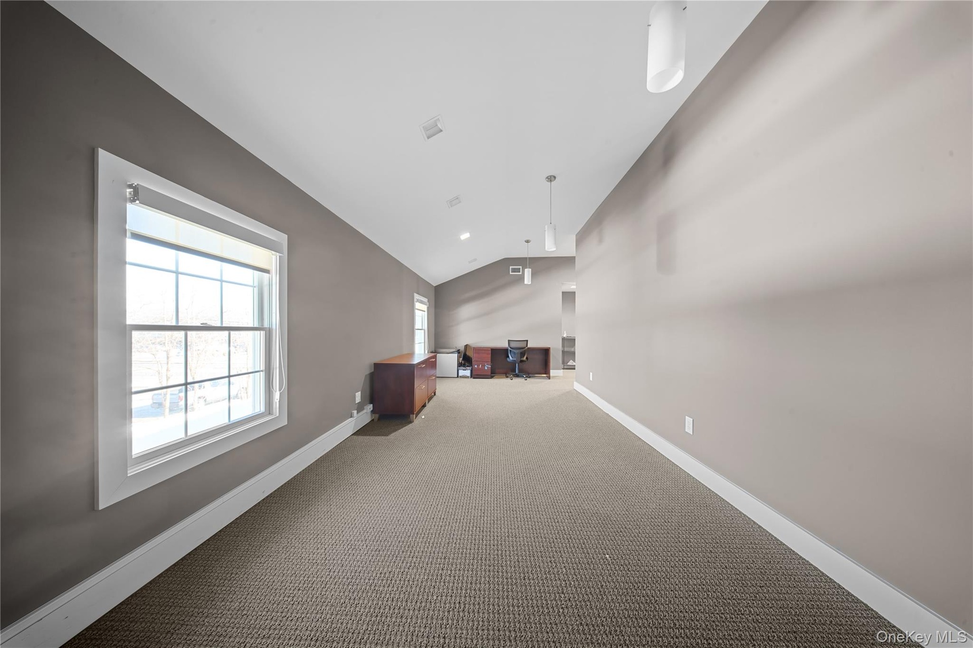 - Unfurnished office with lofted ceiling and light colored carpet