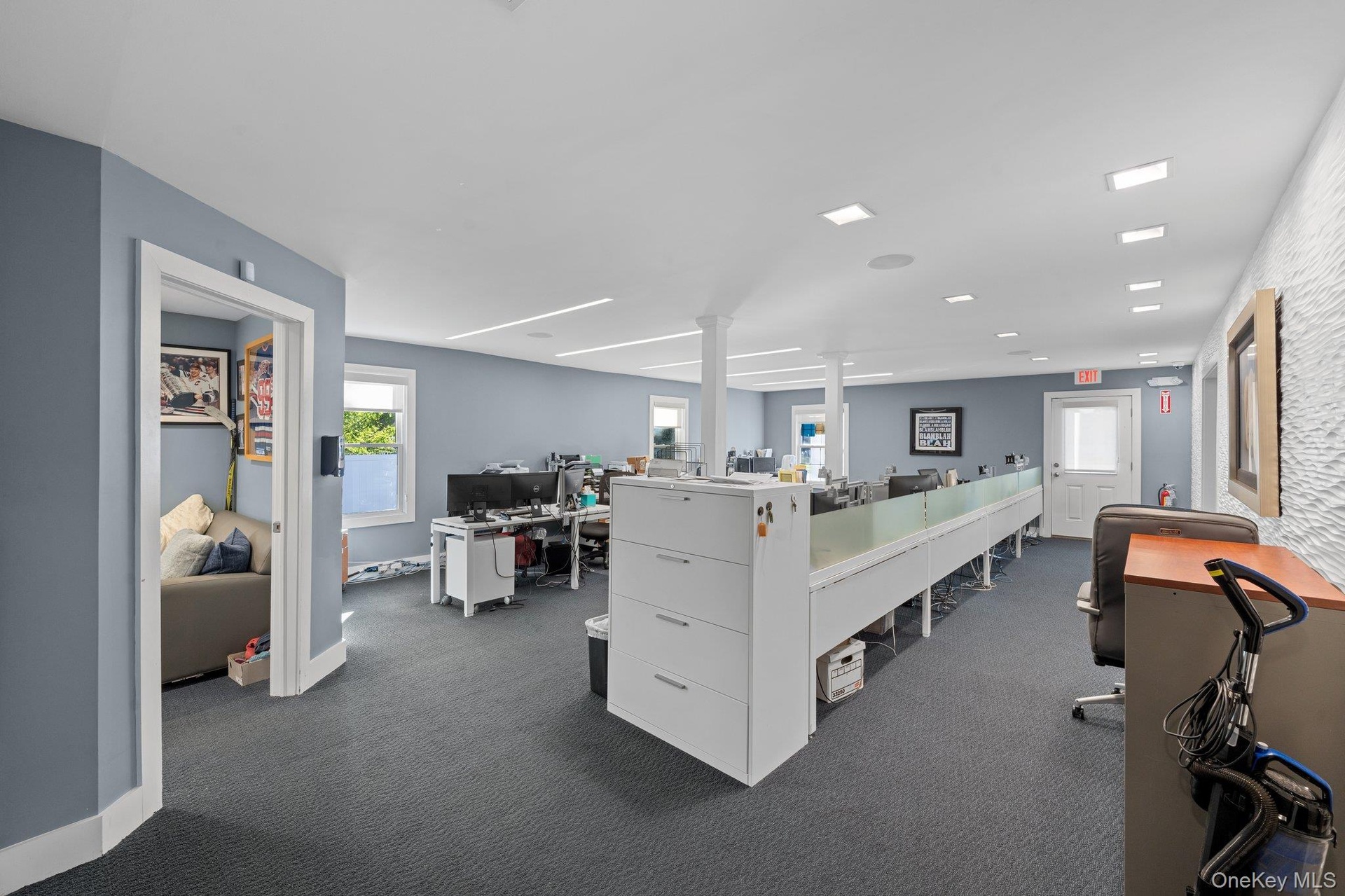- Office area with dark colored carpet and recessed lighting