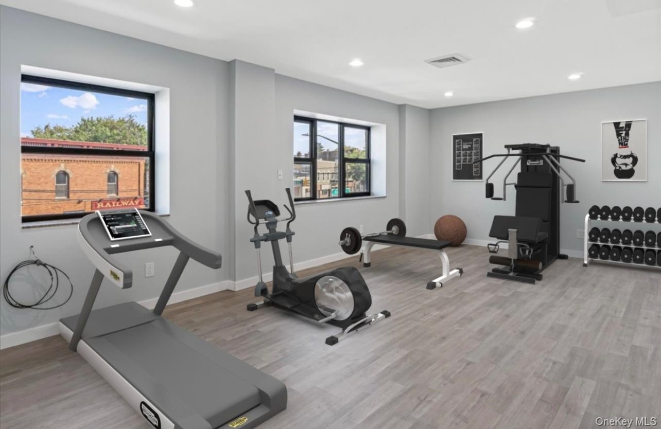 - Exercise area with recessed lighting and light wood-style flooring