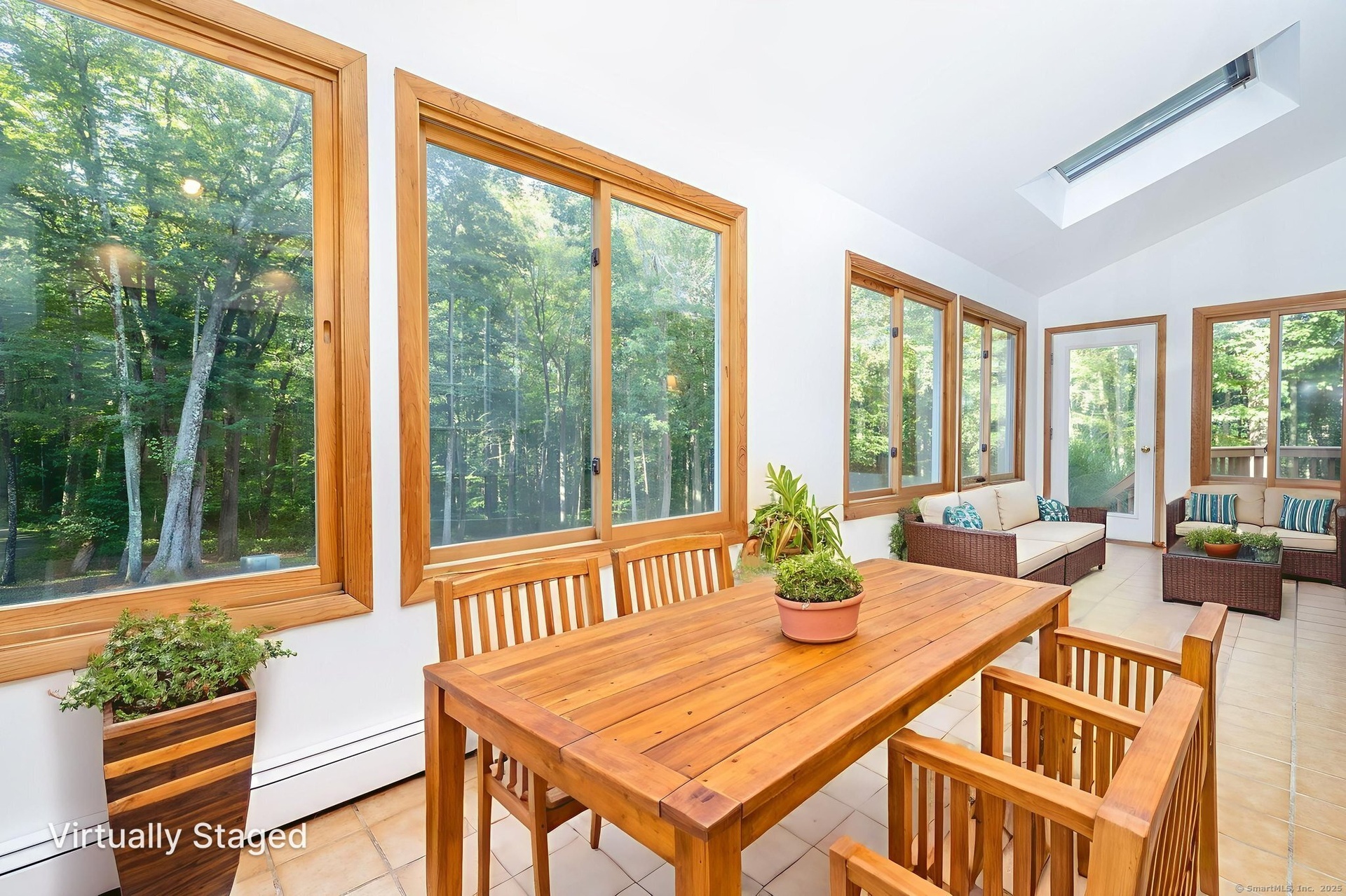 DescriptionThis contemporary home is nestled on 35 acres of private land, offering unmatched peace and tranquility. A long, private driveway leads you to this meticulously maintained property, which has been cared for with the utmost attention to detail, supported by comprehensive documentation. Inside, you'll find three spacious bedrooms, including a primary bedroom suite complete with a full bath, a generously sized walk-in closet and a private deck. The family room features a cozy fireplace, with French doors that open to a screened porch, creating a perfect flow between indoor and outdoor spaces. A bright sunroom offers skylights and a vaulted ceiling, while the open-concept kitchen flows seamlessly into the dining room that has a dramatic two-story ceiling. The lower level of the home offers a large recreational room with a half bathroom. The property also features a covered porch and multiple decks as well as a two-car garage. This home is an ideal sanctuary for those seeking both comfort and nature. With thorough care and attention to detail, this property is a rare find.Amenities- Auto Garage Door Opener