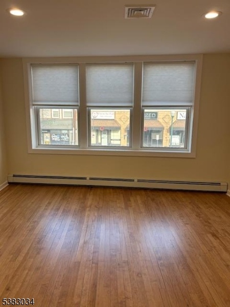 Approximately 425 sq ft of professional office space with large windows providing natural light, hardwood floors, and a private restroom.