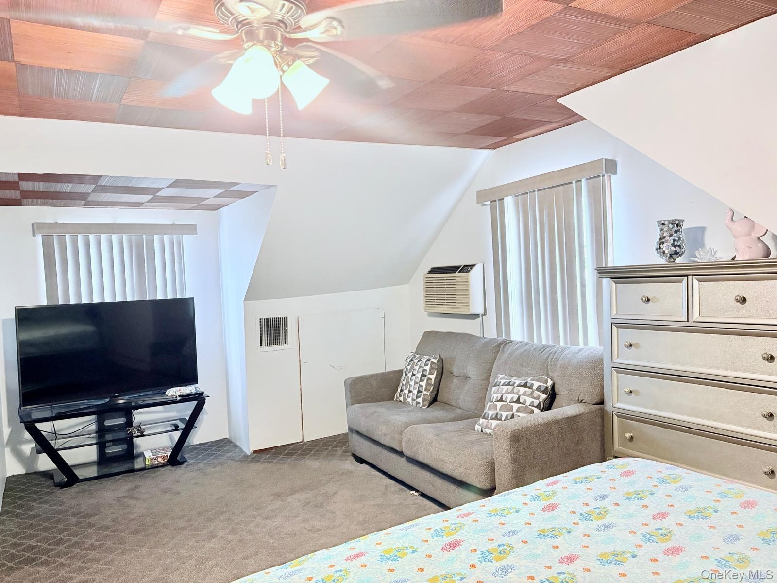 - Carpeted bedroom featuring vaulted ceiling, ceiling fan, and an AC wall unit