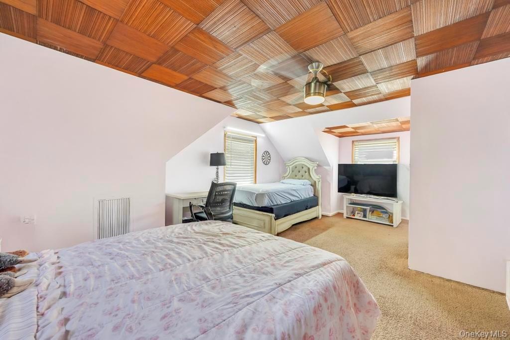 - Bedroom featuring light carpet, wood ceiling, and vaulted ceiling