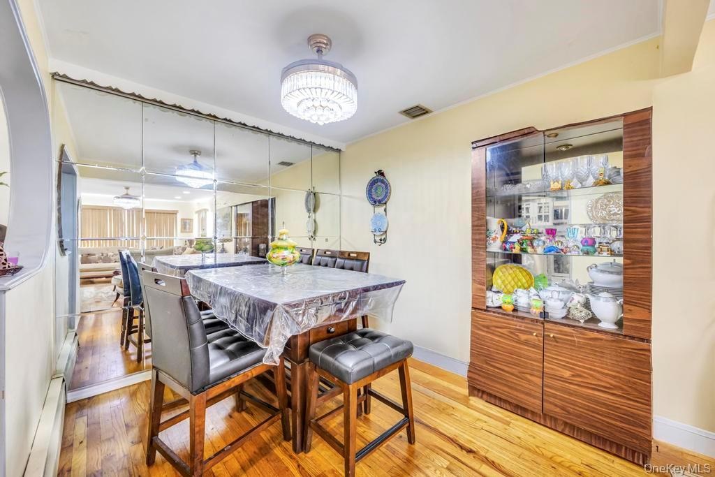 - Dining space with light wood-type flooring, a chandelier, and a baseboard radiator